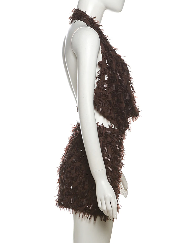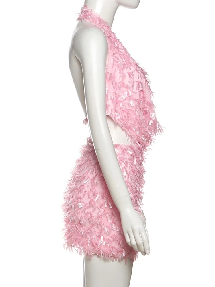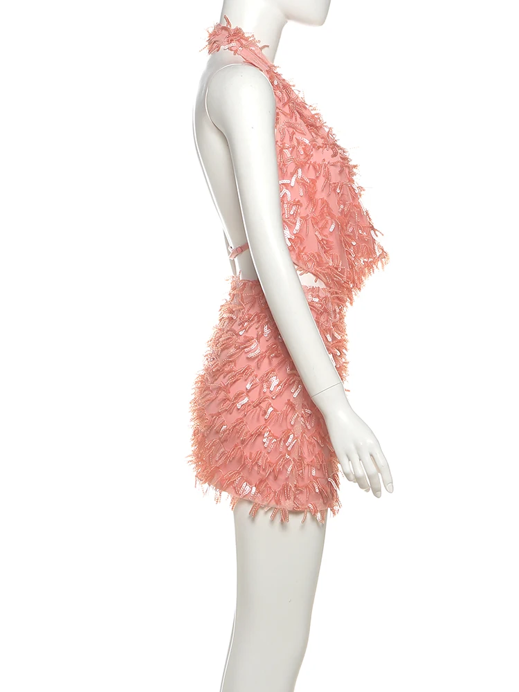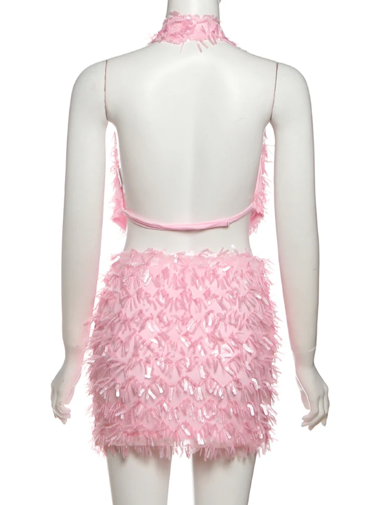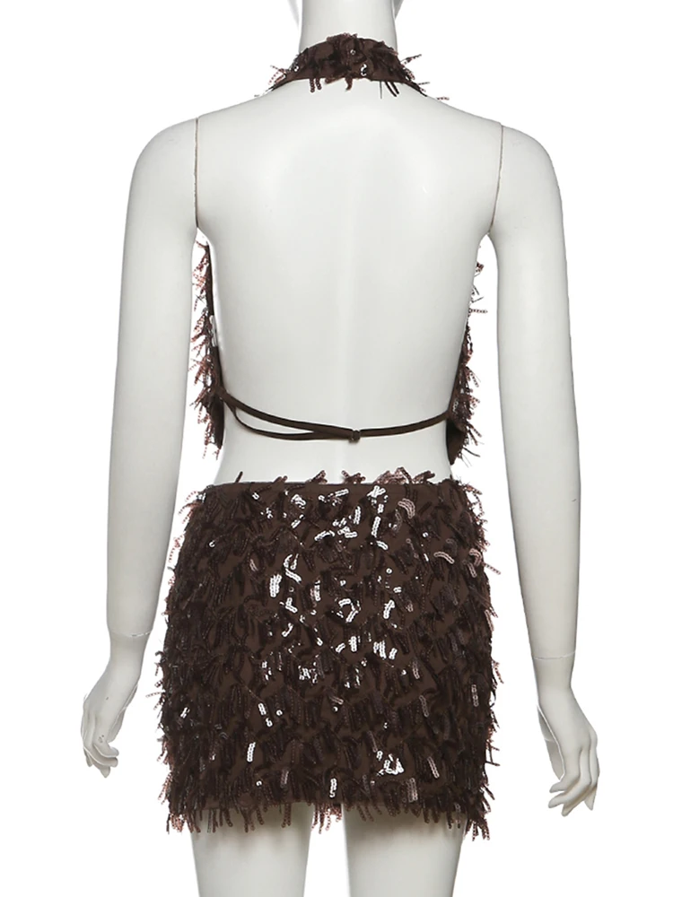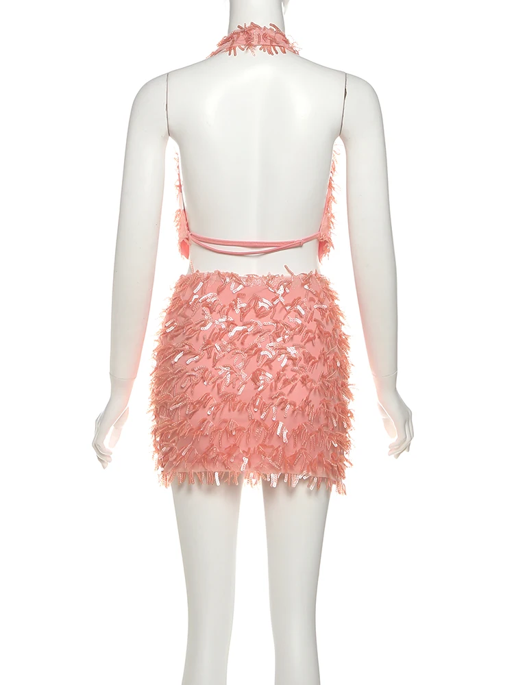 Weird Puss Sequin Tassels 2 Piece Set Women Sexy Swing Collar Tank Tops+Peach Hip Skits Midnight Summer Birthday Party Clubwear